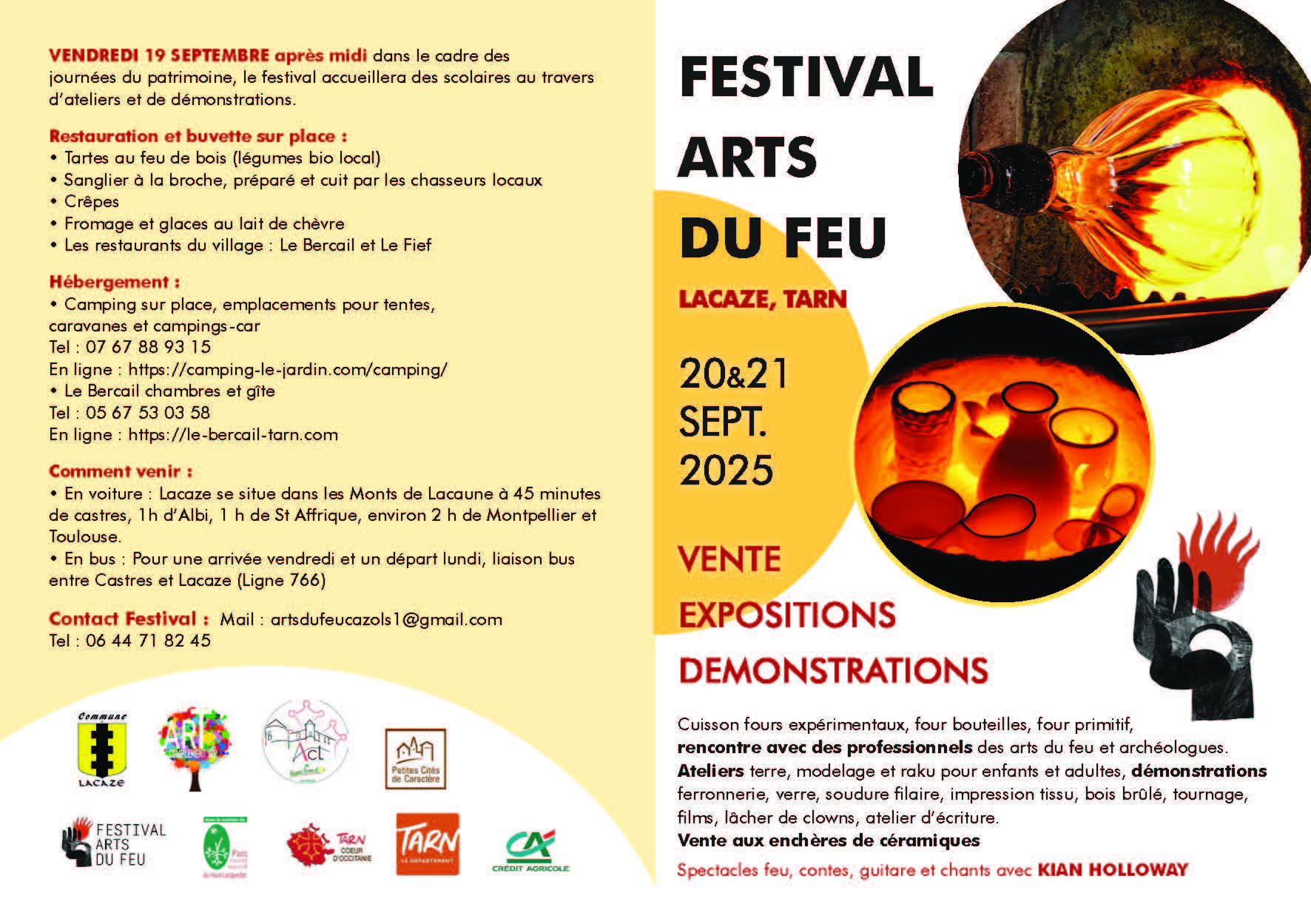 Les Journées du Patrimoine à Lacaze s’illumineront des éclats flamboyants des Arts du Feu. Cet événement unique, porté par "Les Amis du Château", mettra en lumière céramistes, verriers, forgerons et autres artisans du feu, véritables gardiens d’un savoir-faire ancestral. Le thème central sera la rencontre entre tradition et modernité, offrant au public un voyage fascinant à travers les techniques artisanales et artistique du feu et de l’eau tout en intégrant des pratiques respectueuses de l’environnement.